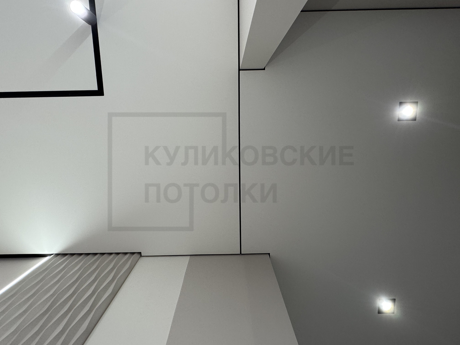 НАТЯЖНОЙ ПОТОЛОК В ВАННОЙ НА ТЕНЕВОМ ПРОФИЛЕ EUROKRAAB С ПАРЯЩИЙМ И КВАДРАТНЫМИ СВИТИЛЬНИКАМИ