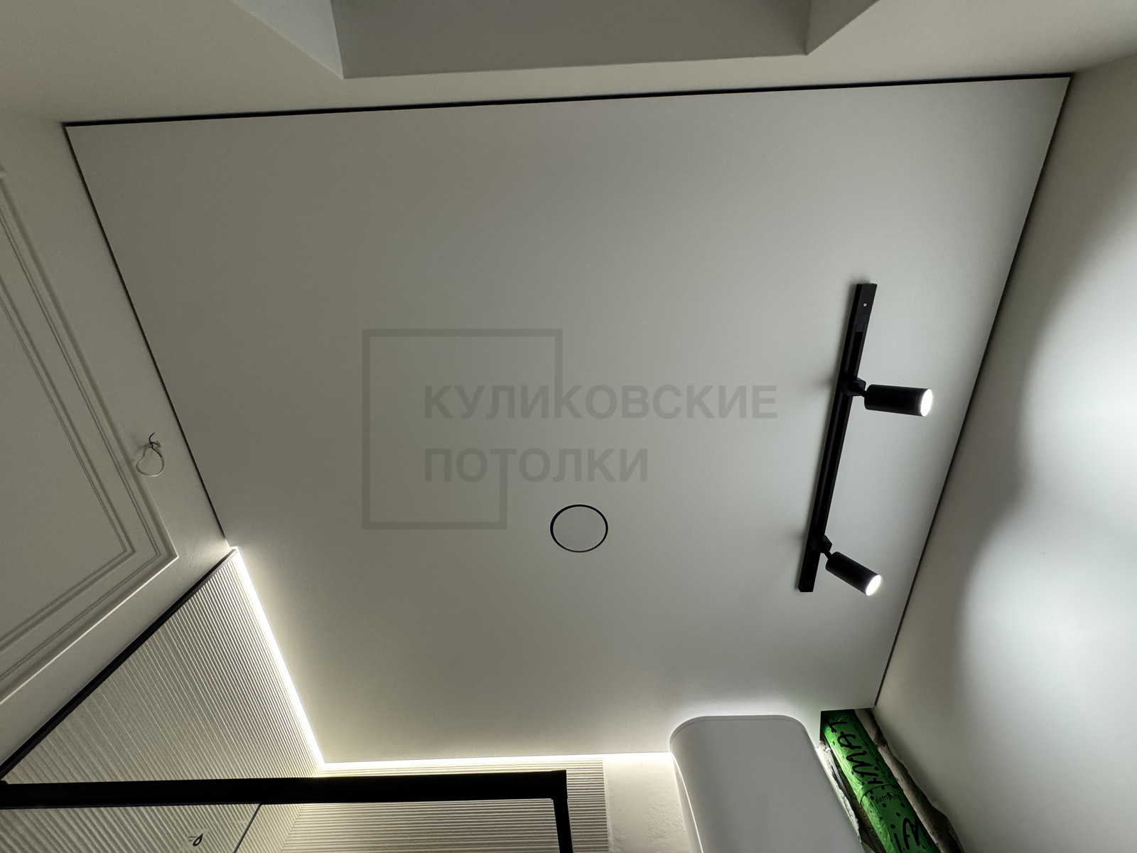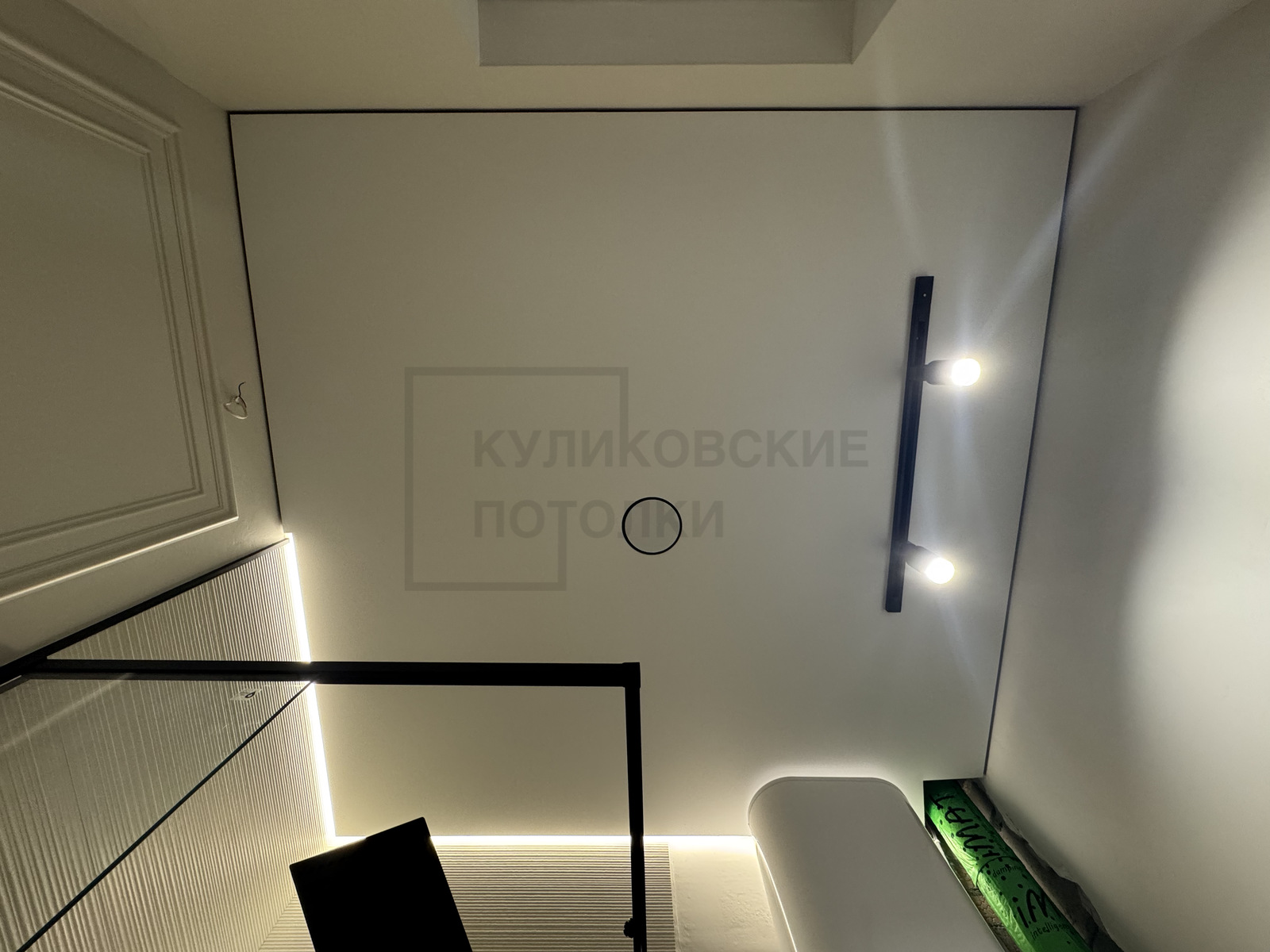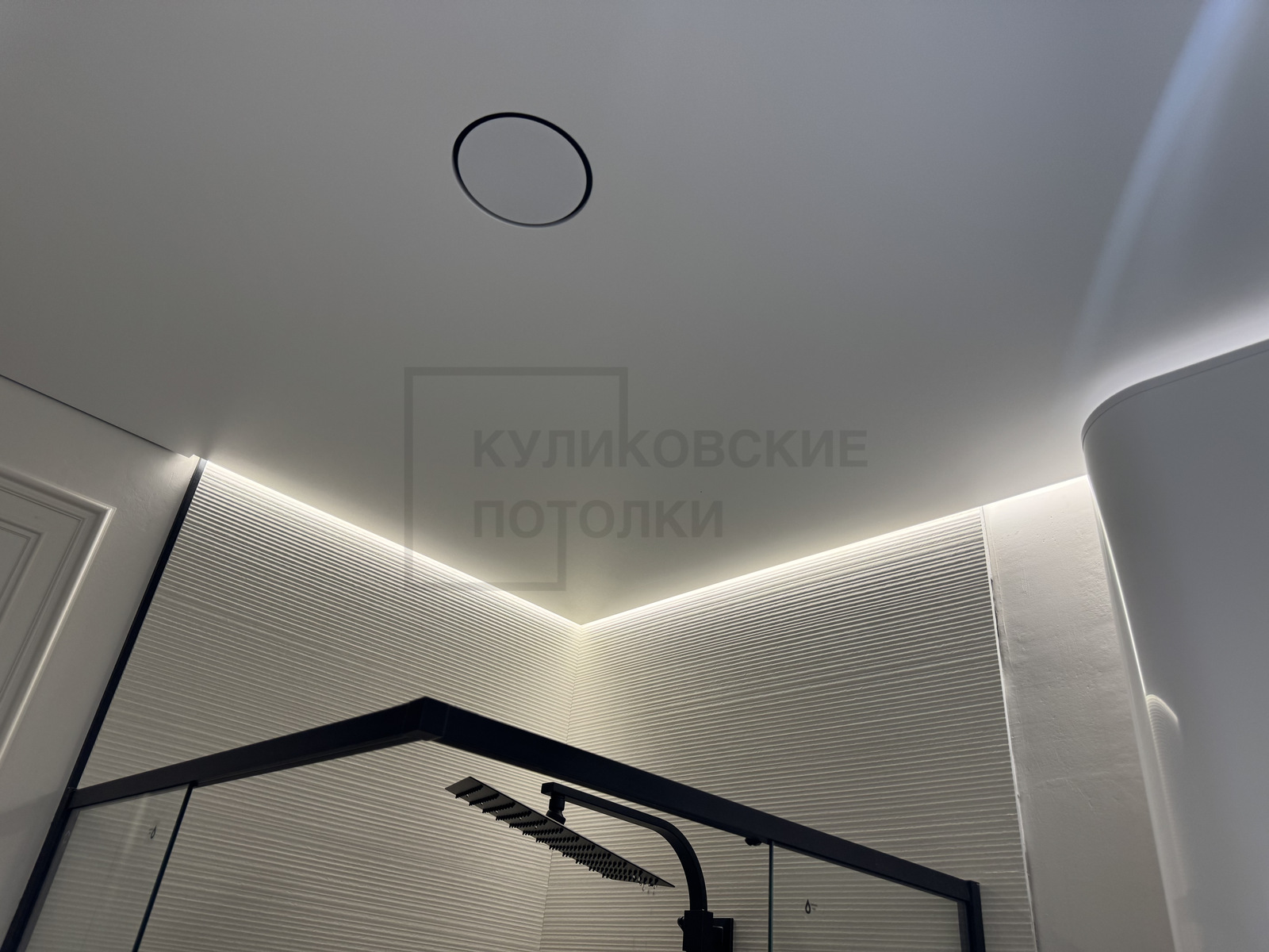 НАТЯЖНОЙ ПОТОЛОК В ВАННОЙ НА ТЕНЕВОМ ПРОФИЛЕ С ПОДСВЕТКОЙ ДУШЕВОЙ И ТЕНЕВЫМ ДИФФУЗОРОМ