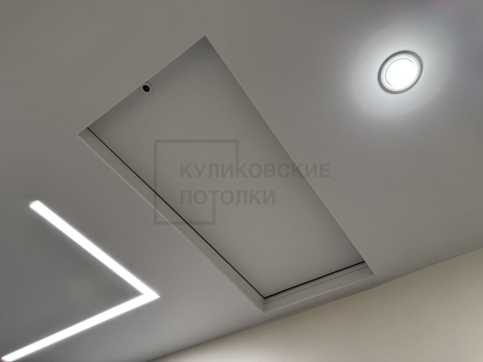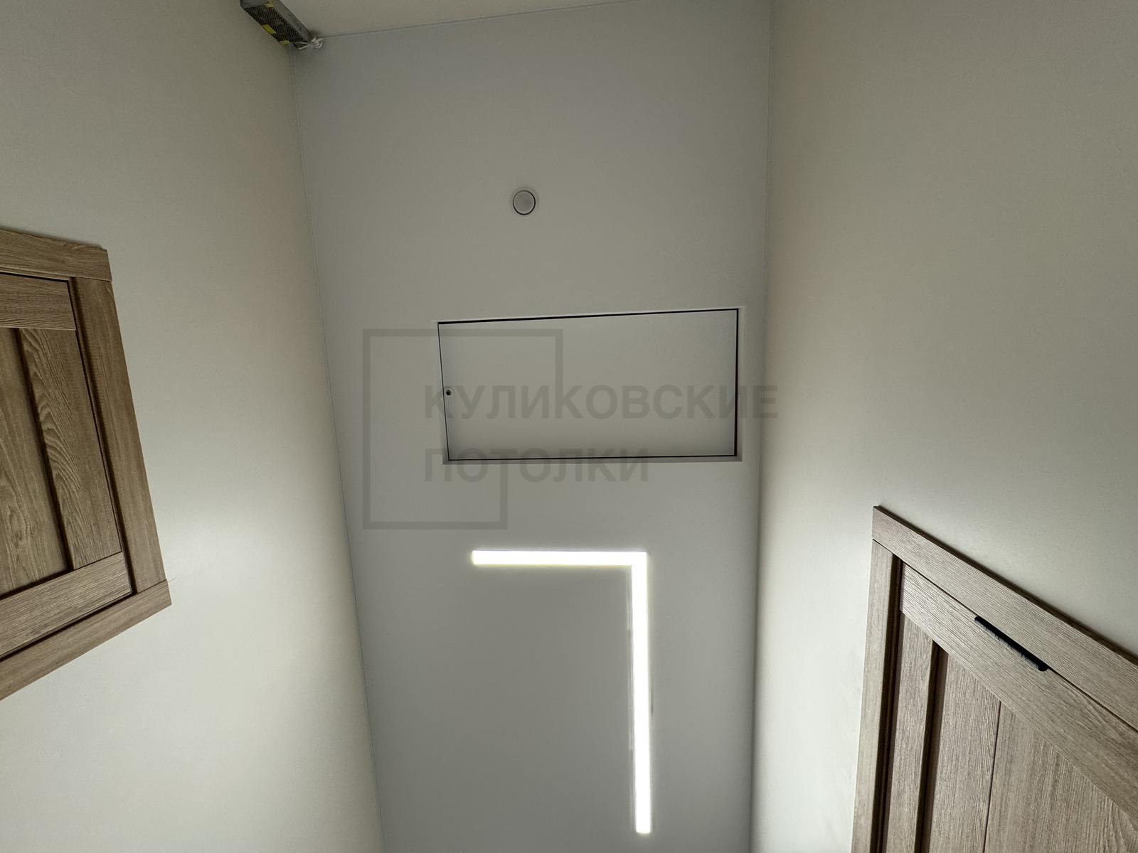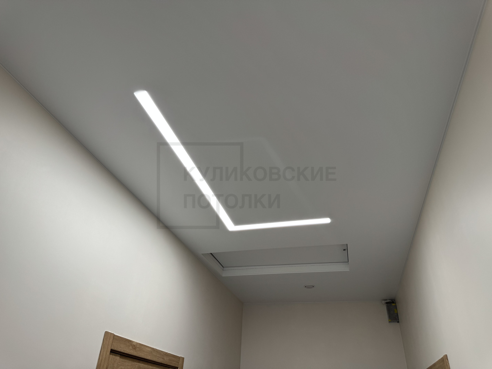 НАТЯЖНОЙ ПОТОЛОК В КОРИДОРЕ СО СВЕТОВЫМИ ЛИНИЯМИ И ЛЮКОМ