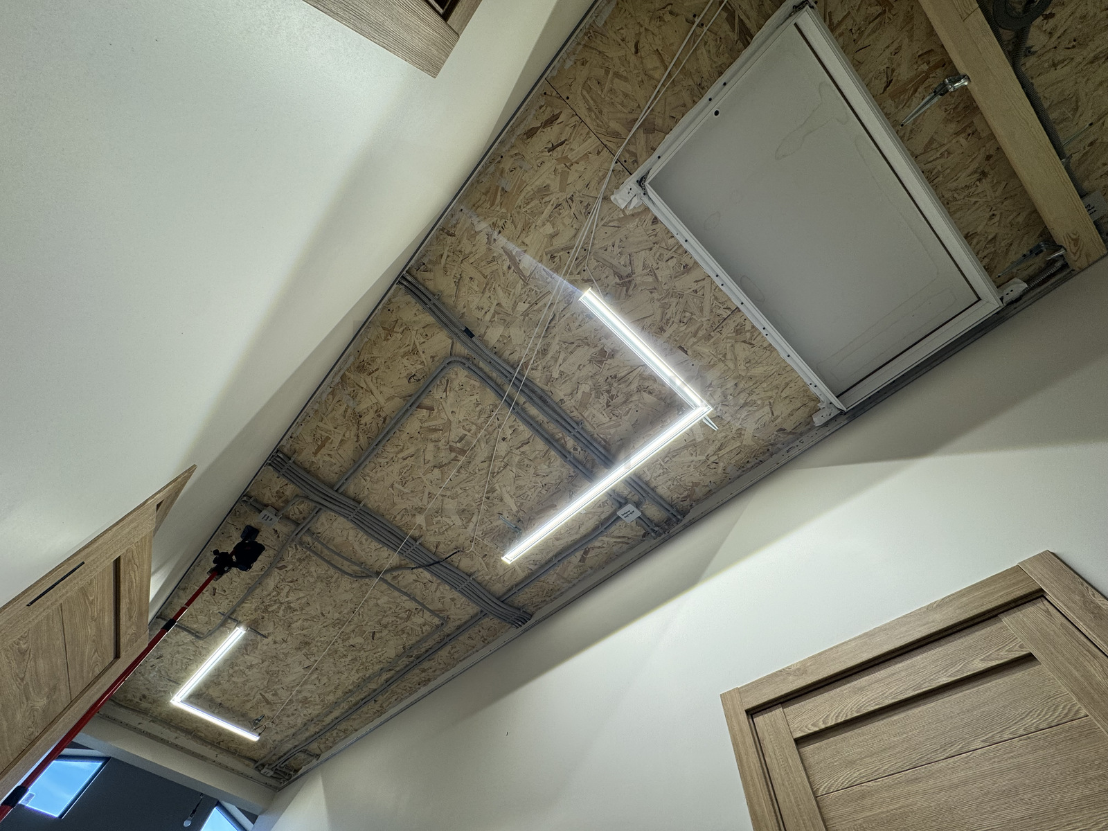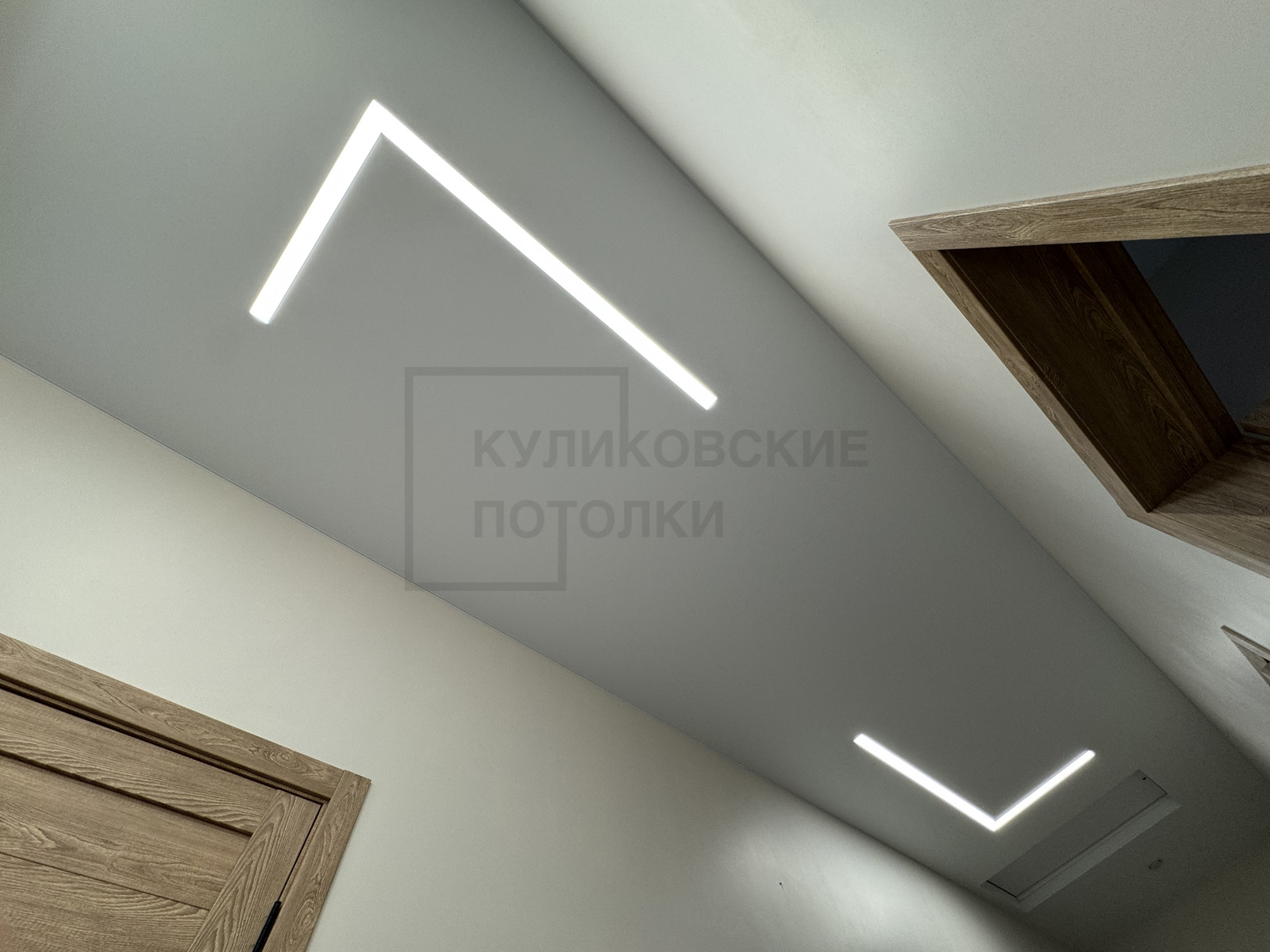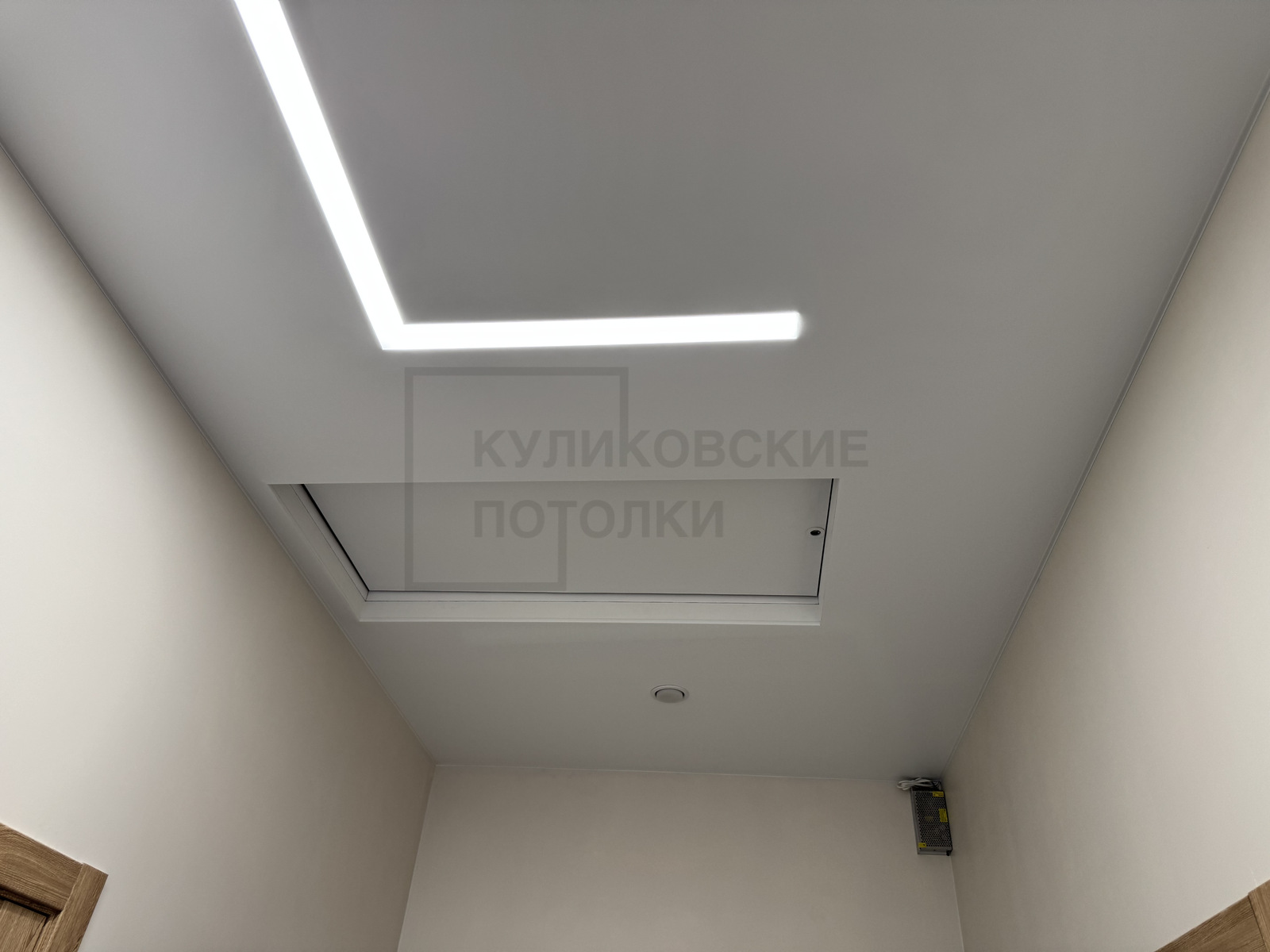 НАТЯЖНОЙ ПОТОЛОК В КОРИДОРЕ СО СВЕТОВЫМИ ЛИНИЯМИ И ЛЮКОМ