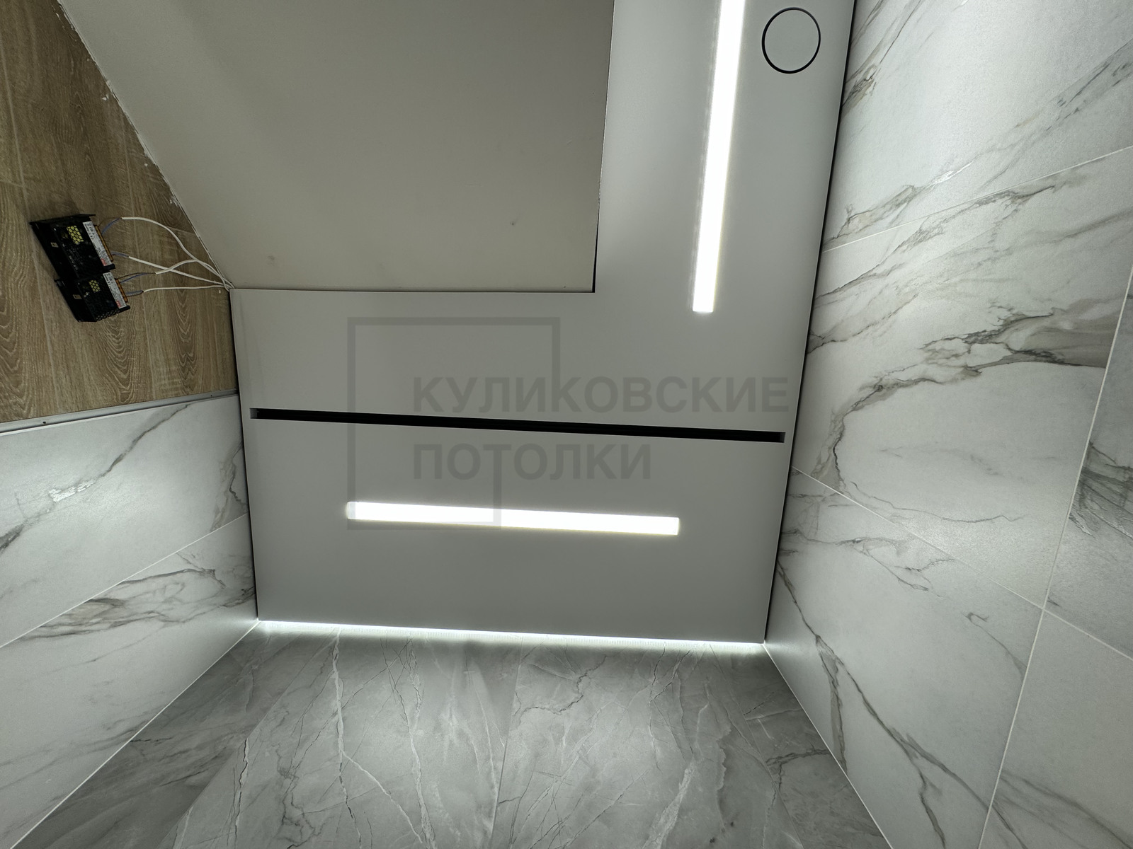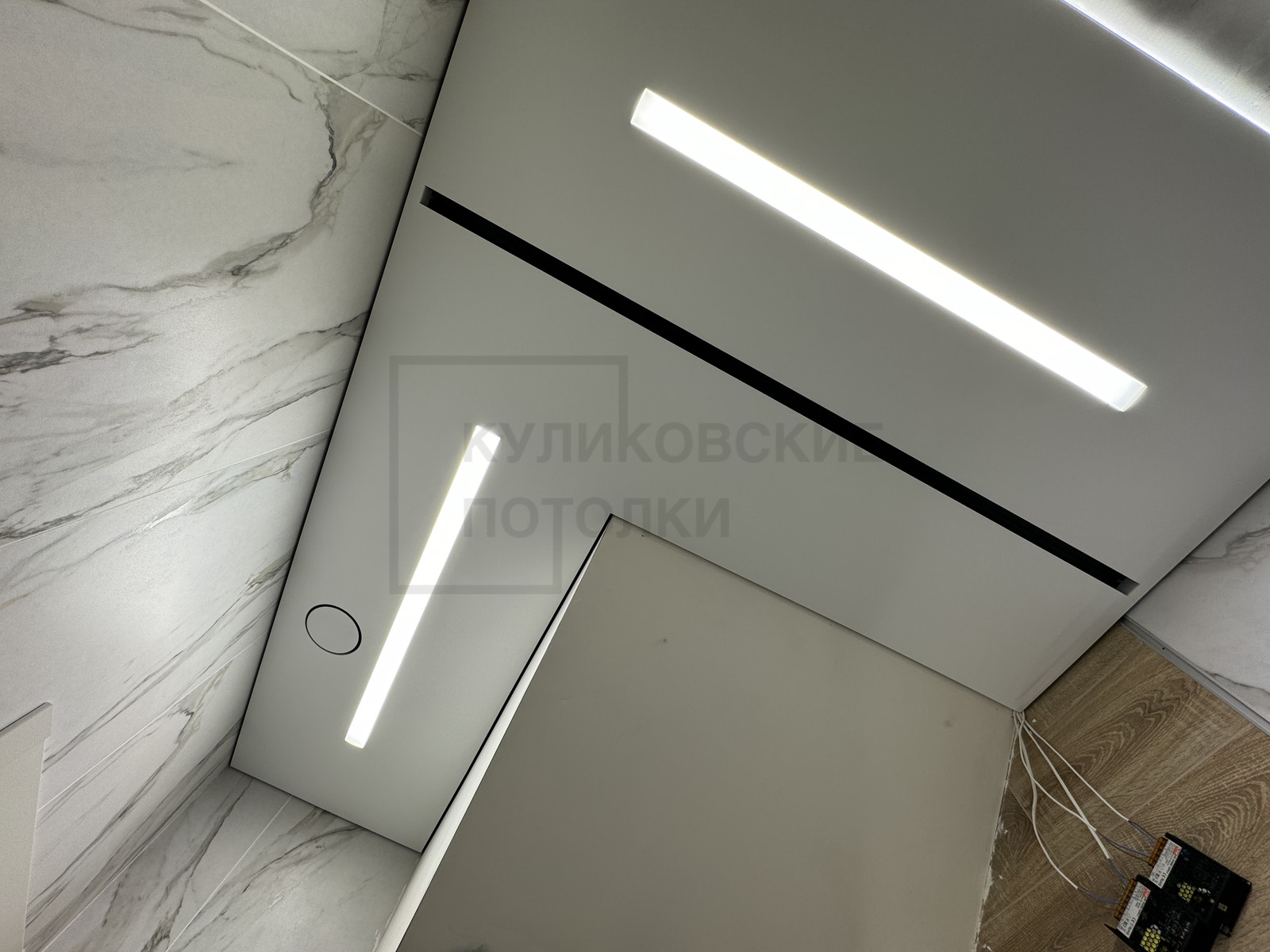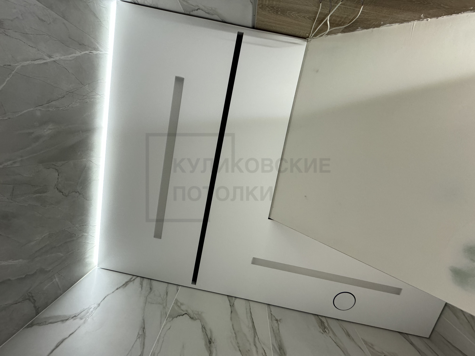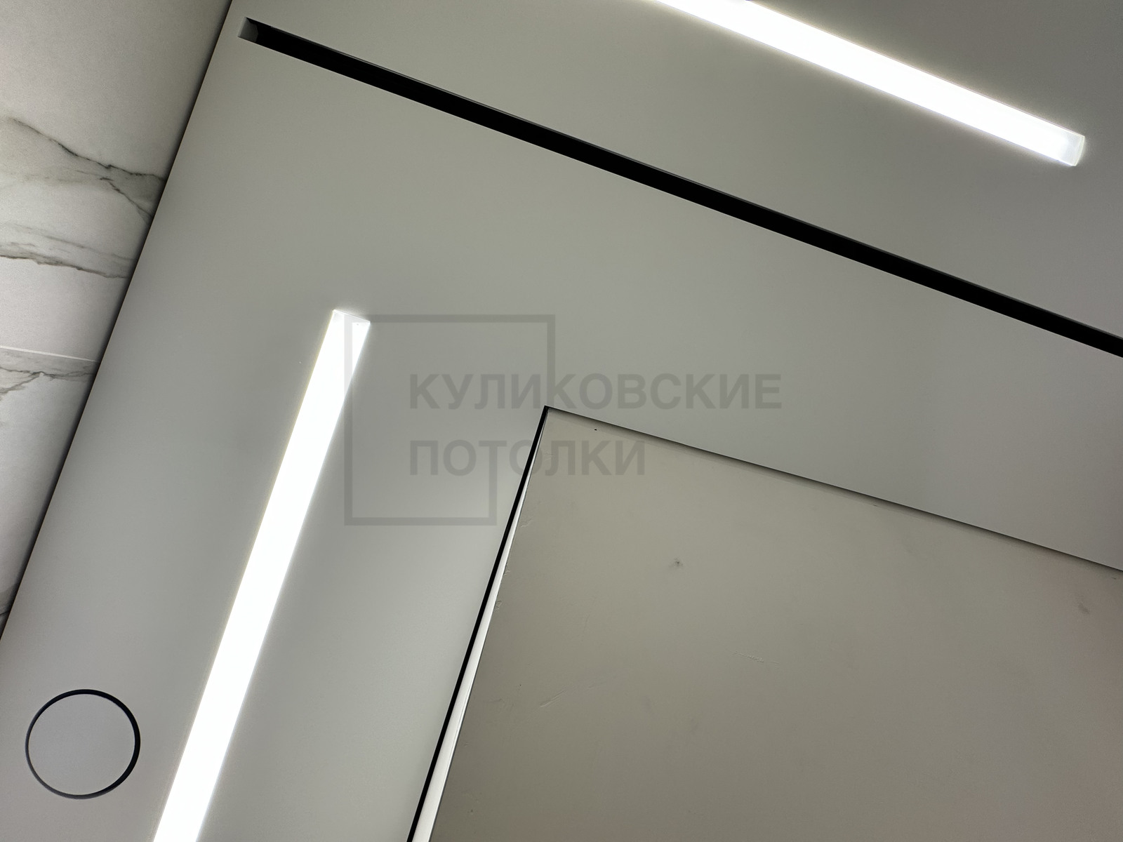 НАТЯЖНОЙ ПОТОЛОК В ВАННОЙ НА ТЕНЕВОМ ПРОФИЛЕ EUROKRAAB С КАРНИЗОМ ПОД ШТОРКУ И ТЕНЕВОЙ ВЫТЯЖКОЙ