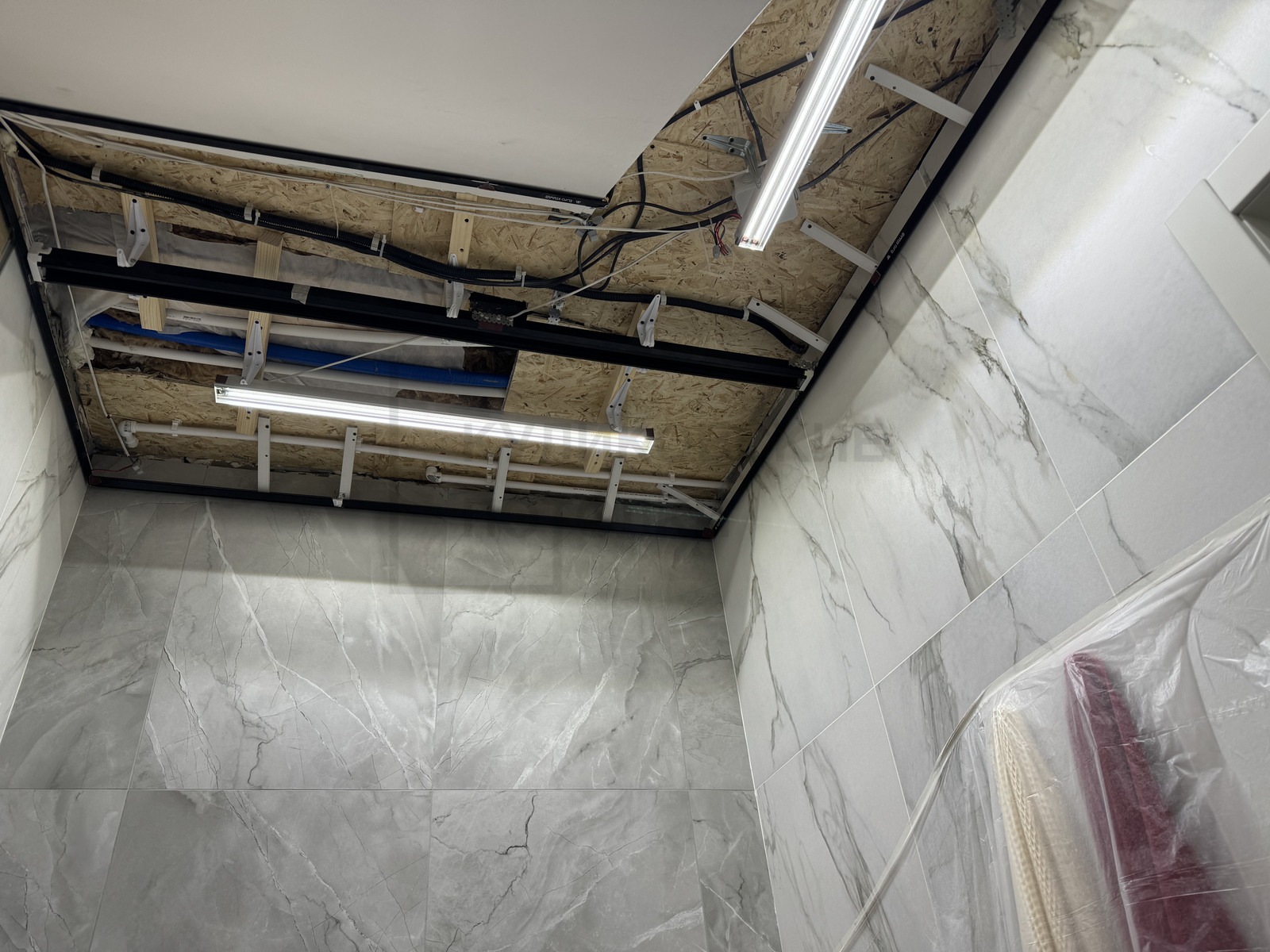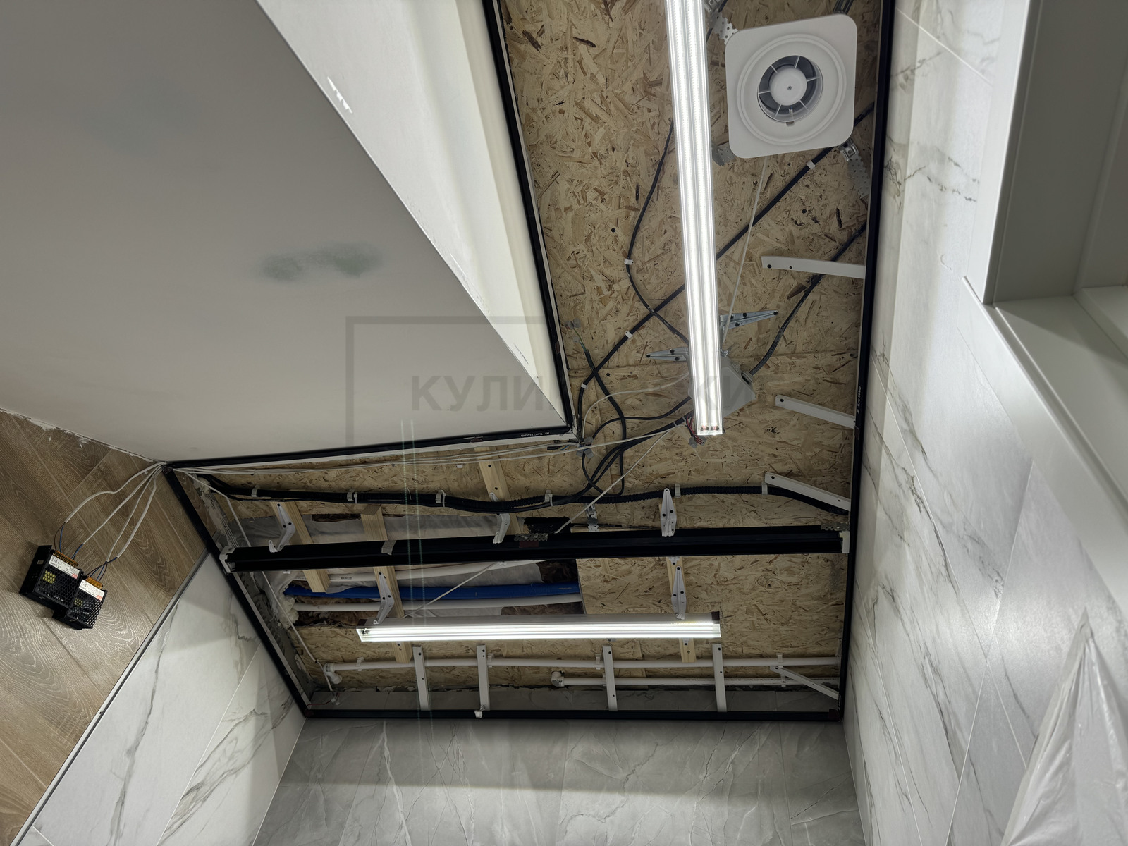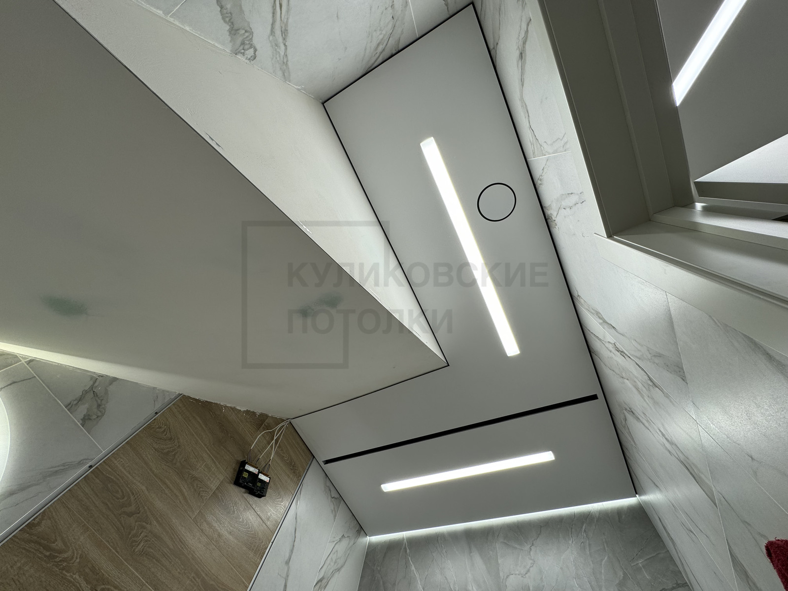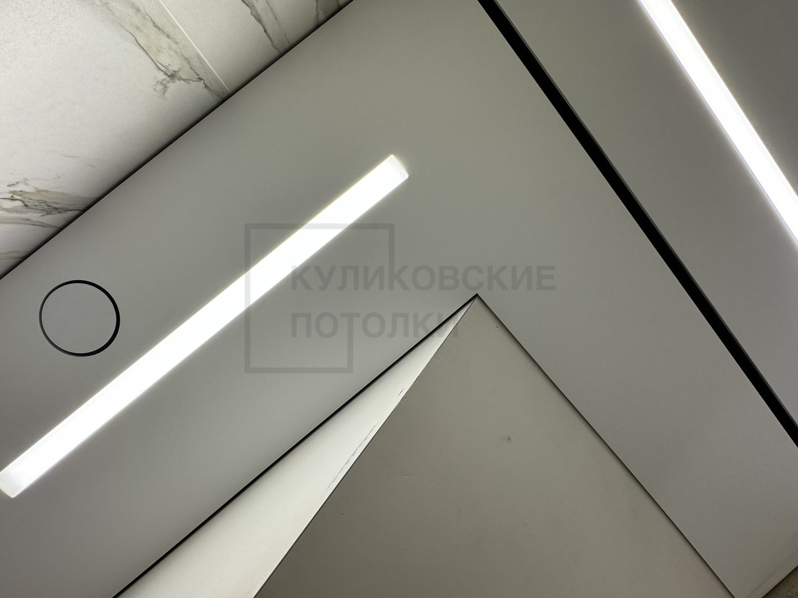 НАТЯЖНОЙ ПОТОЛОК В ВАННОЙ НА ТЕНЕВОМ ПРОФИЛЕ EUROKRAAB С КАРНИЗОМ ПОД ШТОРКУ И ТЕНЕВОЙ ВЫТЯЖКОЙ