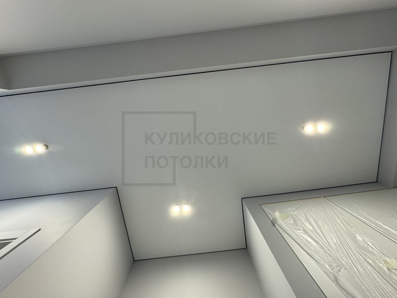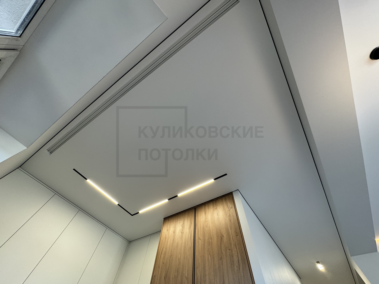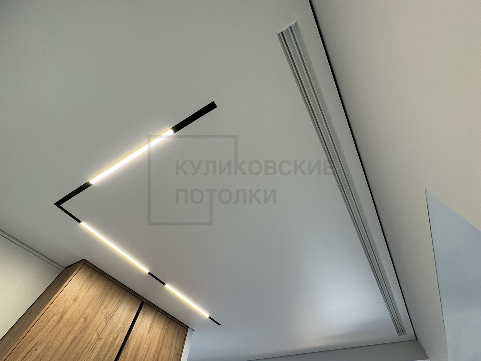 НАТЯЖНОЙ ПОТОЛОК НА КУХНЕ С ТЕНЕВЫМ ПРОФИЛЕМ, КАРНИЗОМ, МАГНИТНЫМ ТРЕКОМ И НАКЛАДНЫМИ СВЕТИЛЬНИКАМИ