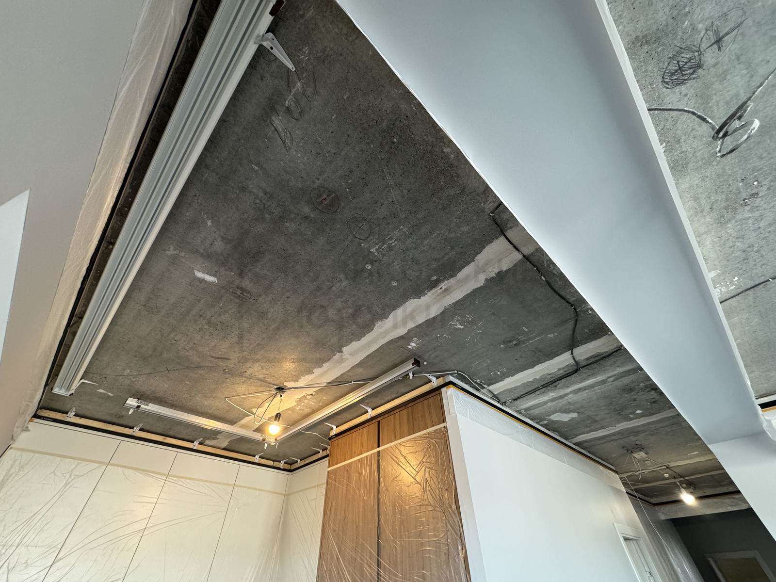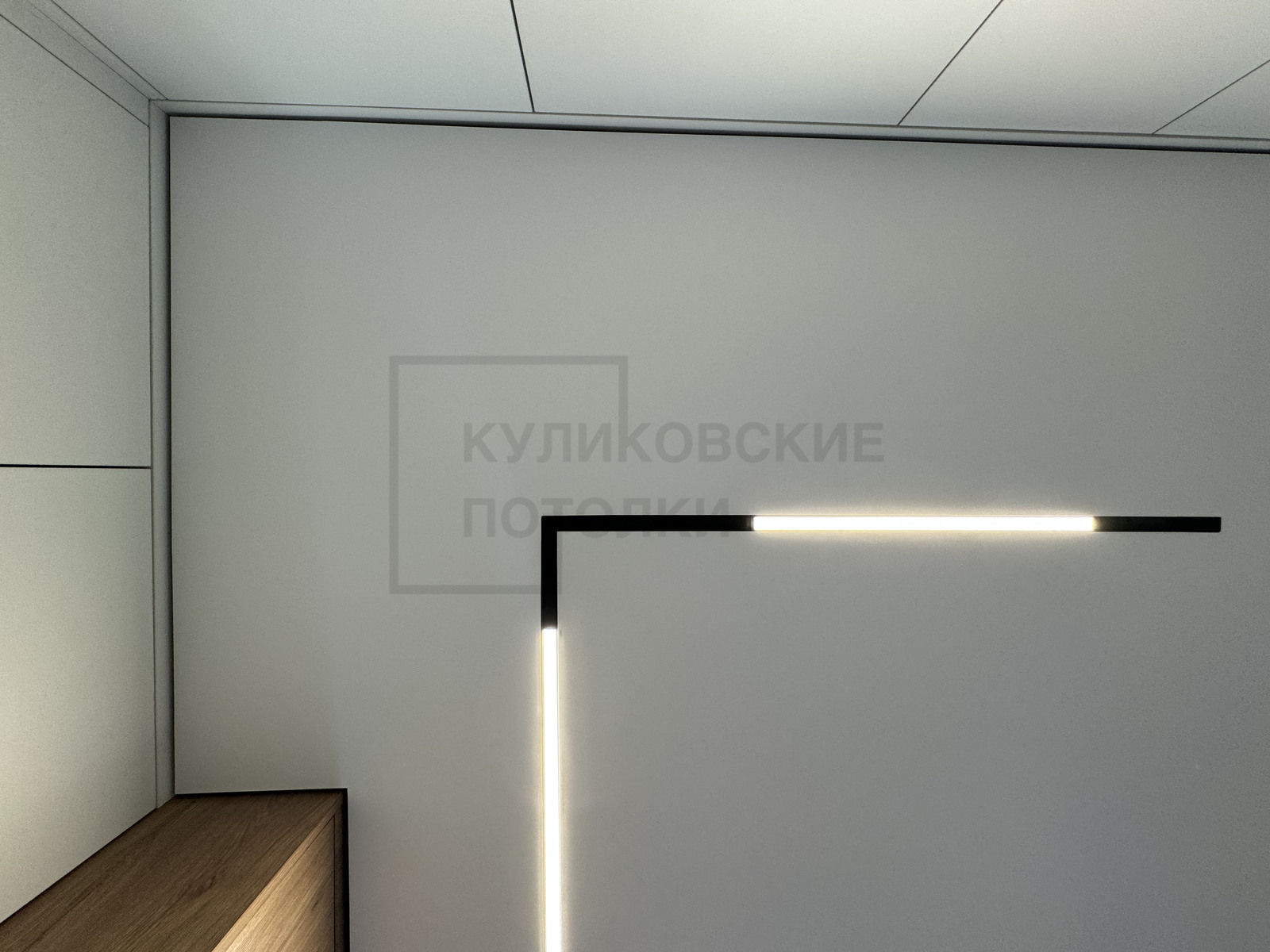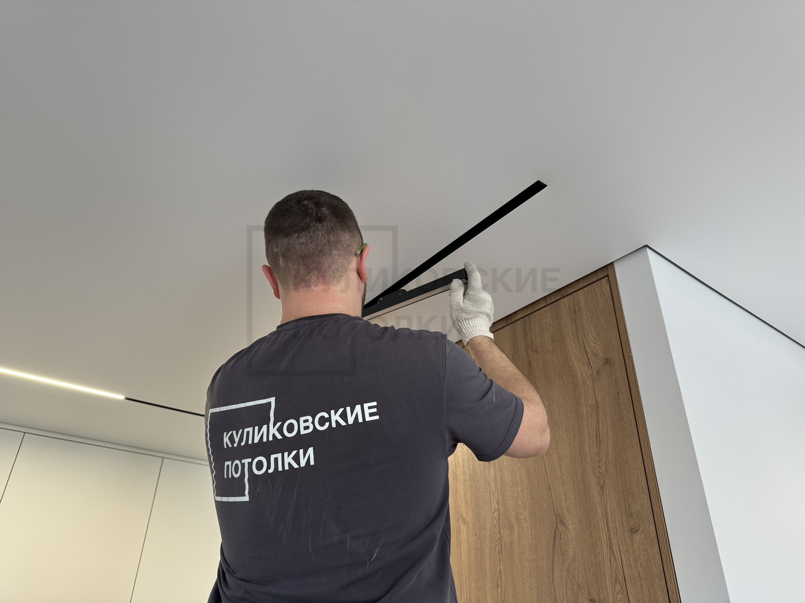 НАТЯЖНОЙ ПОТОЛОК НА КУХНЕ С ТЕНЕВЫМ ПРОФИЛЕМ, КАРНИЗОМ, МАГНИТНЫМ ТРЕКОМ И НАКЛАДНЫМИ СВЕТИЛЬНИКАМИ